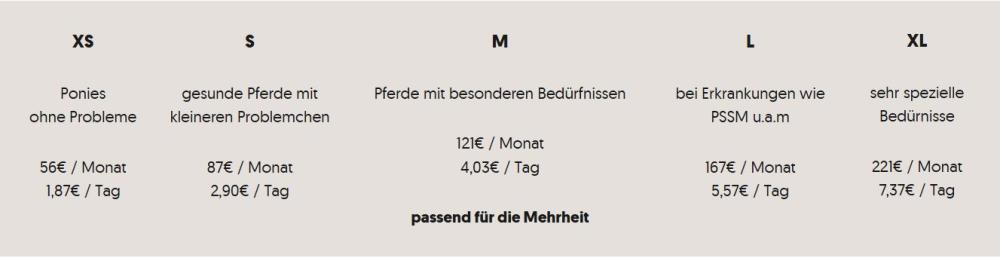 Die Preise orientieren sich an den Bedürfnissen deines Pferdes – transparent, fair und mit allem drin, was es wirklich braucht. Hier eine grobe Orientierung: